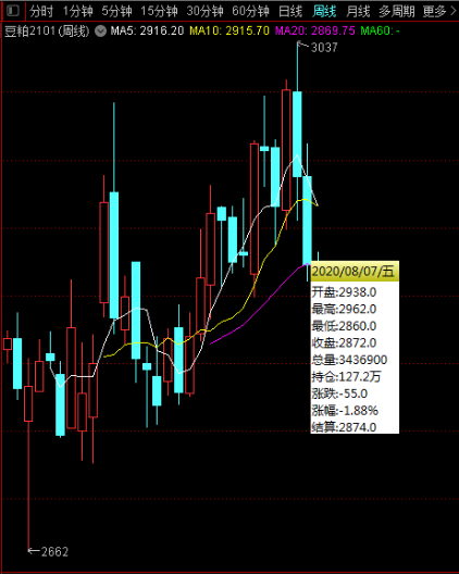 据USDA周度作物生长报告显示,截至8月2日当周,美豆优良率为73%,预估为72%,前一周优良率为72%。随着美豆优良率的再次上调,新季美豆丰产预期自然也就越来越强烈,而这也就导致了上周CBOT大豆出现大幅下跌,主力11合约周跌2.61至869.25。截止7月30日,79/20年度美豆出口净销售34.52万吨,此前预估为20-55万吨,20/21年度美豆出口净销售140.5万吨,此前预估为60-120万吨。
