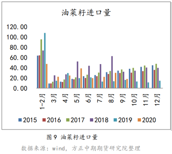 由于与油菜籽出口贸易国关系存在较大不确定性,我国油菜籽进口量一般保持低位水平。据海关总署统计,2020年前半年共进口菜籽147.49万吨,较去年同期下降1.49%,其中加拿大出口占比67.33%,澳大利亚出口占比23.59。从去年起,因为加拿大在部分问题上的错误选择导致中加关系一直处于紧张状态,所以今年以来我国进口加拿大油菜籽的比例有所下调,转至进口澳州油菜籽,但自5月以来,中澳关系也面临问题,所以整体来看,我国油菜籽进口或将继续维持低位水平。
