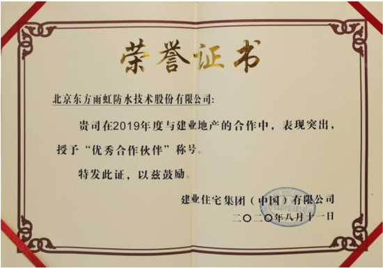8月11日, 东方雨虹 (ORIENTAL YUHONG)获评建业地产“2019年度优秀合作伙伴”。