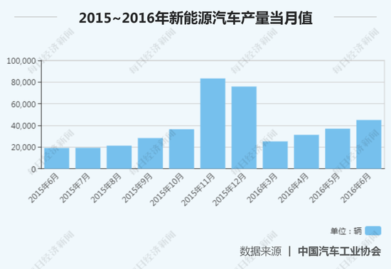 工信部数据显示,2015年一季度时,我国新能源汽车产量仅为2.72万辆,政策发力后,当年10月~12月新能源汽车产量分别达到5.07万辆、7.23万辆、9.98万辆。最终,2015年累计生产新能源汽车37.9万辆,同比增长4倍。