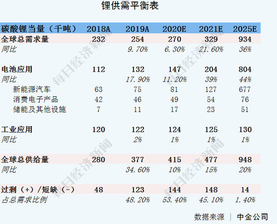 对此,中金公司研报认为,锂短期将维持供给过剩局面,但过剩幅度缩小。根据测算,2020年全球锂总需求量为27万吨,同比增长6.3%,主要系疫情冲击下游车企与电池厂的生产需求,但如果疫情得到控制,需求端有望较快回暖。预计到2025年,锂需求可达到93.4万吨,其中电池应用需求80.4万吨,全球锂供给94.8万吨,总过剩量将由2019年的12.3万吨缩小至1.4万吨。