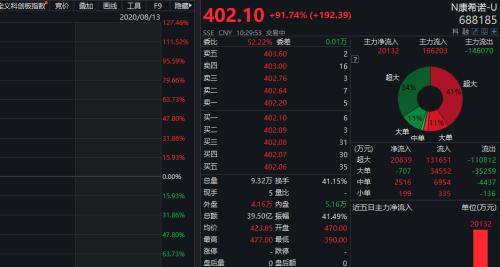 但随着科创板的调整和近期几只上市新股涨幅的收窄,以及各国竞争新冠疫苗研发的激烈化,康希诺开盘后随即涨幅收窄至90%多,最低价下探至390元。