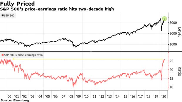 目前,标普500指数较3月份的熊市低点已反弹了50%,距离2月份创下的3386.15点的历史高点不到10点。股价未受企业利润大幅下滑的影响,这在很大程度上要归功于互联网和软件公司的韧性,这些公司的产品迎合了社交隔离措施下的需求。标普500指数当前的预期市盈率为26倍,处于20年来的最高水平。