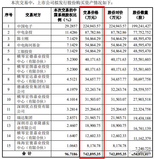 根据交易方案,深桑达A购买中国系统96.7186%股权的交易作价为74.29亿元。