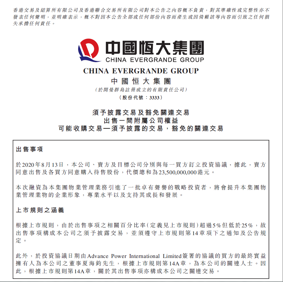 e公司讯,中国恒大8月13日晚间公告,旗下恒大物业合计引入235亿港元战略投资,以支持物业管理业务的发展。记者了解到,恒大物业此次引入的战略投资者包括中信、光大控股等大型央企,云峰基金、红杉资本等顶级投资基金,以及腾讯、周大福等大型企业。恒大此前曾表示,正考虑分拆物业管理服务在香港联交所独立上市。分析人士认为,此次引战获得马云、马化腾等大佬力撑,充分显示恒大物业的巨大发展潜力。