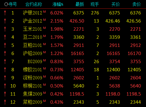 热点栏目8月14日,国内期市开盘,沪银涨逾6%,沪金涨逾2%;玉米、豆二涨近2%,豆粕涨逾1%。