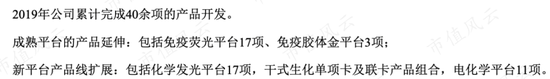 2019年万孚生物披露新产品开发中,成熟平台为免疫胶体金、免疫荧光,新平台为化学发光、干式生物、电化学。