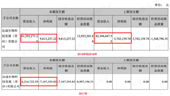 苏州达成曾承诺2017年-2019年累计营收不低于2亿,累计净利润不低于4300万,不过苏州达成实际完成的营收和净利润均远远不及预期。