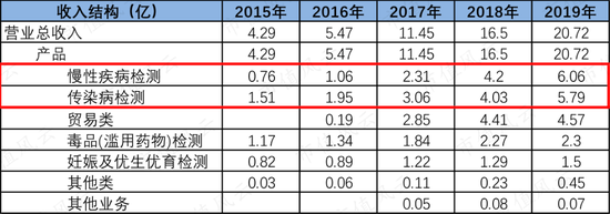 上市之后,妊娠检测和毒品检测收入比例一直下降,2019年已不足20%。反而慢性疾病检测和传染性检测收入比例不断提高,2019年已经超过50%。