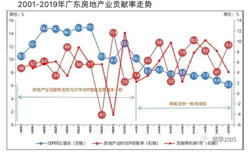 再从广东情况看,2002~2011年当年房地产业贡献率与次年GDP增速走势基本一致,反映出房地产业对经济的拉动(2008年表现为拖累)作用较为明显。但自2012年以来,两者走势的一致性趋于减弱。
