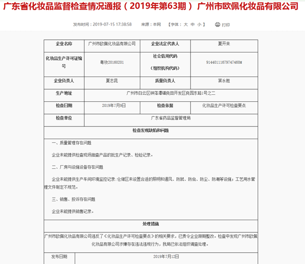 原标题:广州欧佩化妆品公司再被点名警告 存在设备清洗不干净等问题
