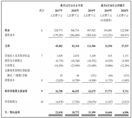 根据初步招股文件显示,在过去2017年、2018年、2019年三个财政年度和2020年前四个月,岳峰高分子的营业收入分别为2.29亿、3.67亿、4.98亿和1.23亿人民币,相应的净利润分别为2,203.0万、3,877.2万、5,199.9万和689.6万人民币。
