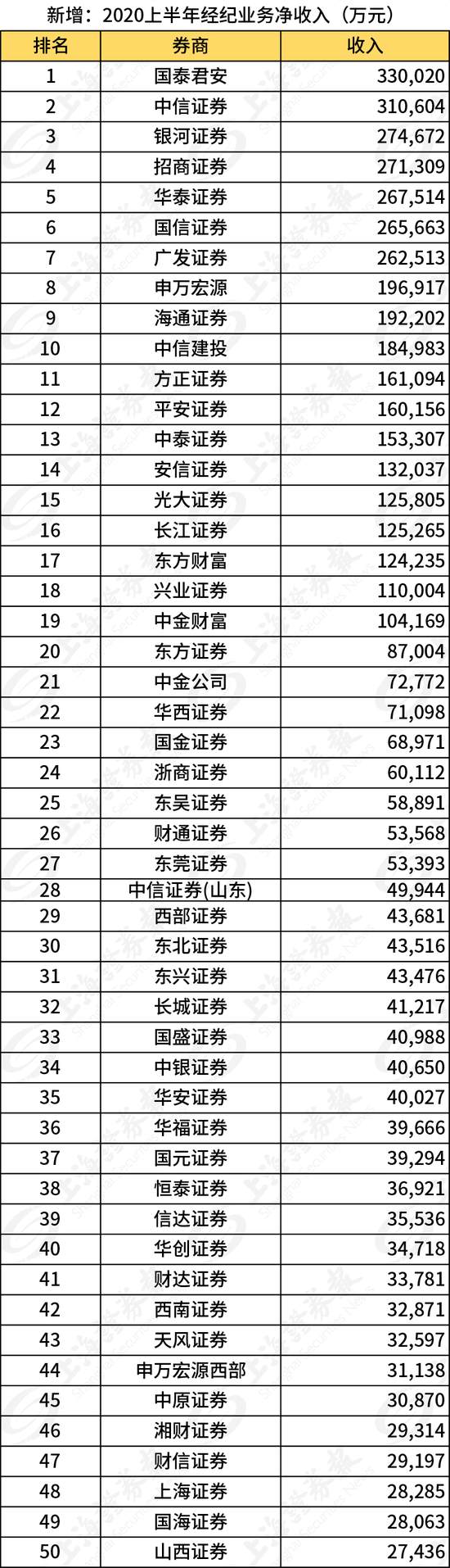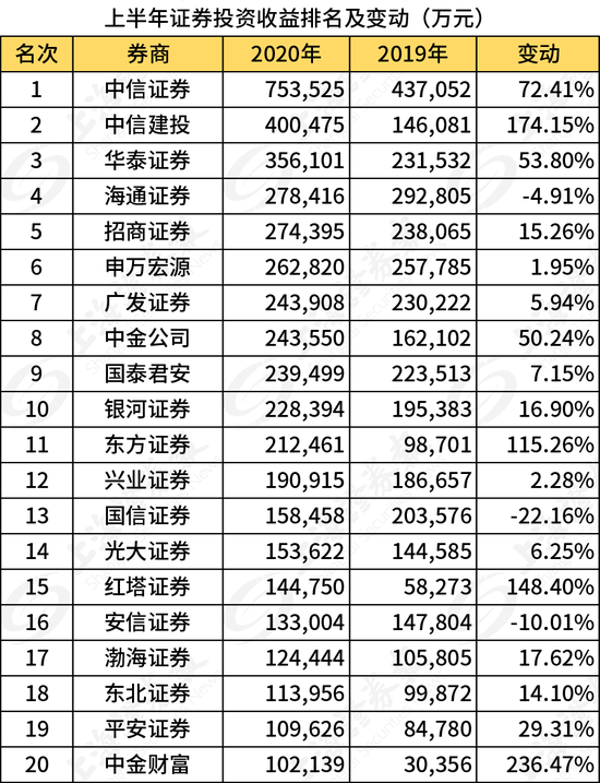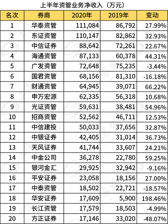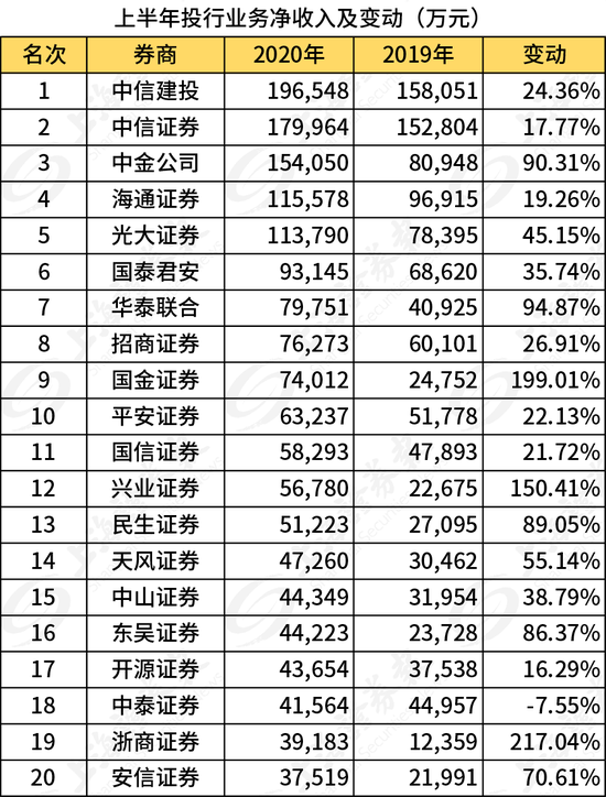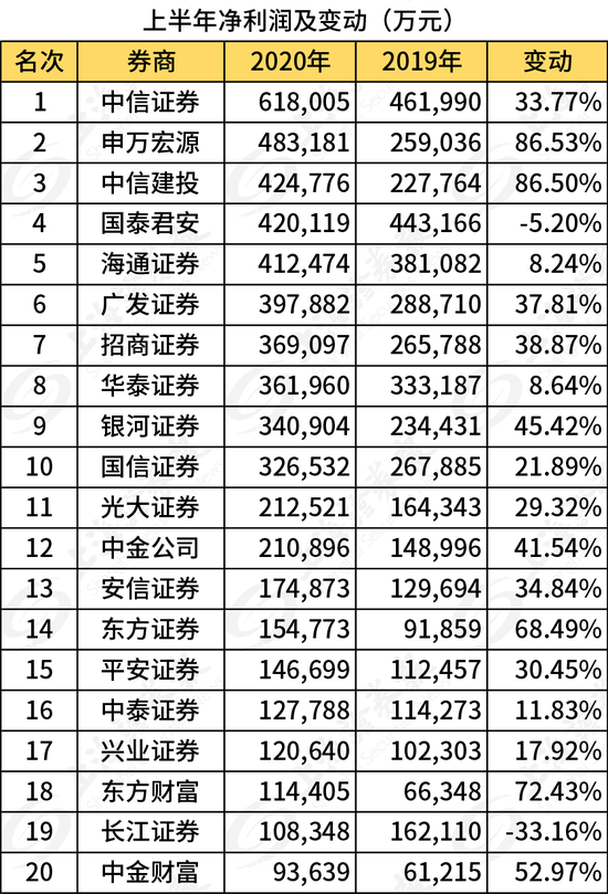 近日,中国证券业协会(下称“中证协”)向各券商下发了券商2020年上半年度经营业绩排名情况。