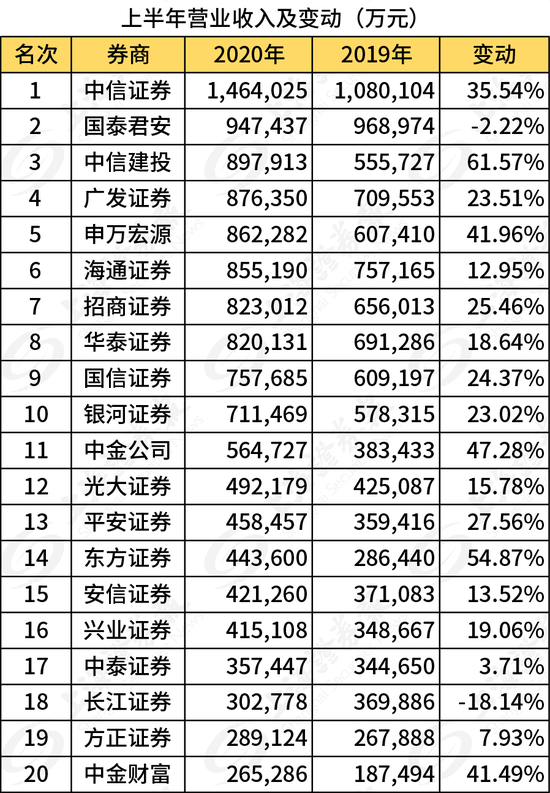 中信证券今年上半年营收146亿元,同比增35.54%,是全行业唯一一家上半年营收破百亿的券商。营收排名前20的券商中,只有国泰君安和长江证券同比负增长,其余券商均增幅较大。