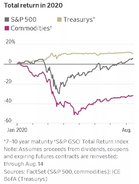 投资者还开始买入原材料,他们认为,如果美联储重振经济的努力引发通胀,原材料将会有出色表现。衡量通胀预期的市场指标(如损益平衡通胀率)在夏季有所上升,但以历史标准衡量,这些指标仍处于低位。