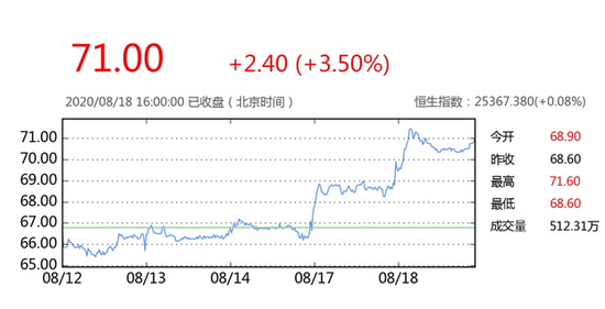 北京时间2020年8月18日,恒安国际开盘报价68.90港元,收盘于71.00港元,相比上一个交易日的收盘价68.60港元,大涨3.5%。当日最高价71.60港元,最低达68.60港元,成交量512.31万手,总市值844.67亿港元。