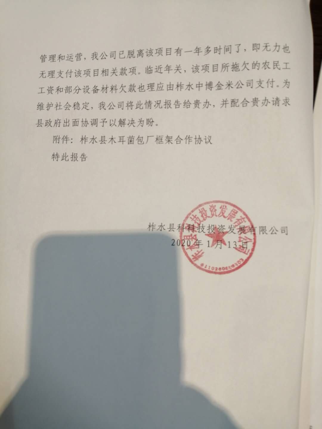 李巍提供给澎湃新闻的一份《科投公司关于金米木耳菌包厂项目拖欠农民工工资及设备材料尾款情况报告》显示,科投公司按照相关协议,在2018年7月13日把木耳菌包厂交由柞水中博金米菌业发展有限公司(以下简称“中博公司”)全面接管,包括全部债权债务,该项目自此已归中博公司管理和运营,科投公司已脱离项目一年多,既无力也无理支付该项目相关款项,该项目所拖欠的农民工工资和部分设备材料欠款也理应由中博公司支付。