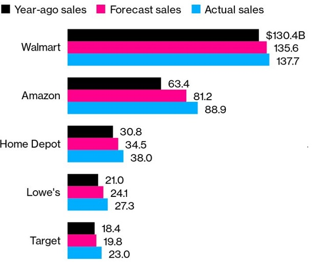 如下图所示,家居装修连锁店家得宝和劳氏,沃尔玛和塔吉特百货,当然还有网络巨头亚马逊今年夏季财季的销售额都超出了分析师的预期,而且各高出数十亿美元。其中黑色柱代表一年前的销售,红色柱代表预测的销售,而蓝色柱代表实际的销售。