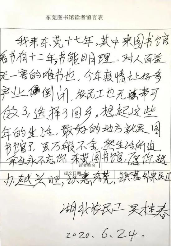 但受疫情影响,吴桂春工作的工厂停工,无奈之下他打算返回湖北老家。离别之前,他给图书馆写下了感人的130多字,“我来东莞十七年,其中来图书馆看书有十二年。书能明理,对人百益无一害的唯书也……虽万般不舍,然生活所迫,余生永不忘你,东莞图书馆……”