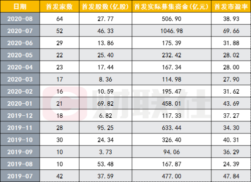 此外,8月份以来,首发企业达64家,也创历史单月新高。7月份实际募资1046.98亿元,该数据为A股近30年第二高的首发募资额。