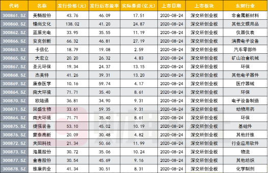 据东财Choice数据显示,截至8月20日,上市日期在8月24日的注册创业板企业有19家,实际募资总计209.27亿元,发行后市盈率均值为40倍,发行价最高的为风尚文化138.02元,募资24.87亿元,也是这19家中实际募资额最高的公司。
