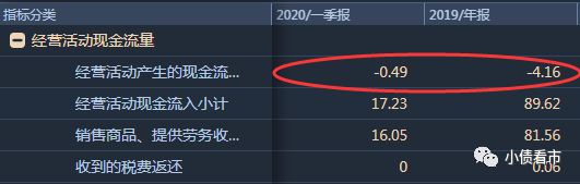值得注意的是,2019年延安必康的经营性现金流净额已由净流入转为净流出状态,流出4.16亿元,今年一季度再次净流出4857.51万元,可以看出其经营获现能力恶化。