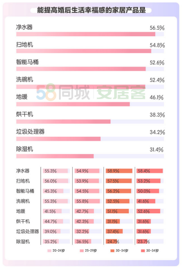 婚前的激情与浪漫、婚后的柴米油盐,都是美好生活的一部分。为让平淡的生活变得更浪漫,小夫妻在购置家居用品时会有更多考虑。58同城、安居客关于都市男女婚房置业的调研中,80后、90后普遍认为能提高婚后生活幸福感的家居产品包括净水器、扫地机、智能马桶和洗碗机。90后对洗碗机的需求相比80后来说普遍更高,对于洗碗机的需求占比过半;80后则对地暖相对更感兴趣。