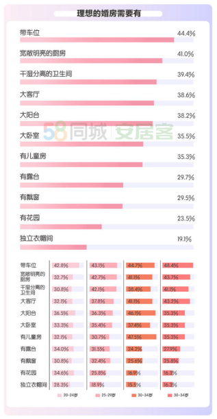 理想的婚房很丰满,也充满了对未来高品质生活的追求。58同城、安居客《2020年都市男女婚房置业报告》数据显示,选择要有车位的购房者占比最多,为44.4%,此外,宽敞明亮的厨房及干湿分离的卫生间也排在靠前的位置。从年龄上看,年轻的90后更注重自身居住的舒适性,20-24岁的购房者选择独立衣帽间的占比在28.3%,对于飘窗的需求也要高于80后;相比对于独立衣帽间、飘窗等,80后对于大客厅、大阳台的需求明显高于90后,此外,80后则更多为下一代考虑,选择“有儿童房”的30-34岁购房者占比47.5%。