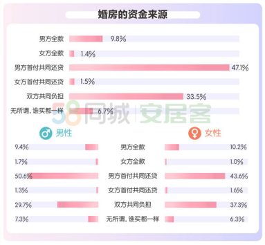 购房是成家过程中的重大开销,掏空“六个钱包”的现象也不少见。在58同城、安居客的调研中,有47.1%的人表示婚房是由男方出首付,双方共同还贷来解决。此外,选择婚房资金由双方共同负担的占比也有33.5%。安家不是某一方的义务,而是需要男女双方共同承担起责任,共同还贷成为时下最多家庭的选择。