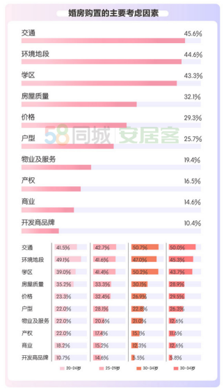 买房无小事,特别是对于新婚夫妻来说,房子买在哪里需要考量的因素也更复杂。58同城、安居客《2020年都市男女婚房置业报告》指出,新婚夫妻在选择婚房时,交通、环境地段、学区这三项是多数购房者优先考虑的因素,占比均超过40%。相比90后,80后的购房者对于学区房的关注度相对更高;90后则更看重物业及服务;90后中,超一成的人表示选择婚房时也很看重开发商的品牌,考虑房屋质量的人群占比也高于80后。