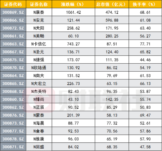 18只新股总市值当日增1646.44亿元,N康泰、N安克总市值增幅最高,分别为433.30亿元、327.34亿元,二者收盘时总市值分别为474.12亿元、596.88亿元。