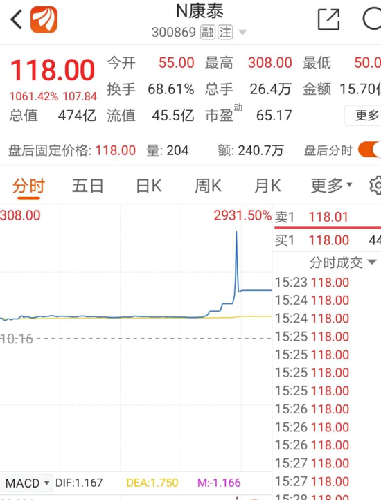 N康泰股价尾盘一度冲高至308元/股,涨幅2852%,临近收盘三分钟,股价又快速回落,截至收盘,股价报118元,涨1061.42%,3分钟振幅高达1790.58%。