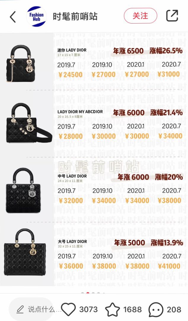 据小红书平台上的信息,另一奢侈品牌迪奥(Dior)已在今年7月再次进行了一波涨价,同样也是自2019年7月起一年涨价4次的节奏。以迷你Lady Dior这款包为例,目前售价为31000元,较去年7月涨幅达26.5%。