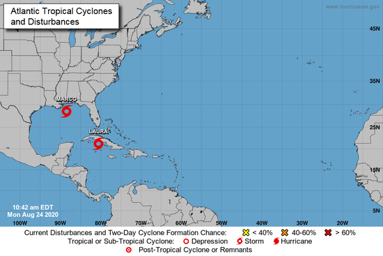 两场风暴将在间隔24-36小时的时间内登陆,这是前所未有的情况。得州到阿拉巴马州的海岸将受到广泛破坏,为防范风暴,墨西哥湾沿岸的炼厂已经开始减少原油生产活动。