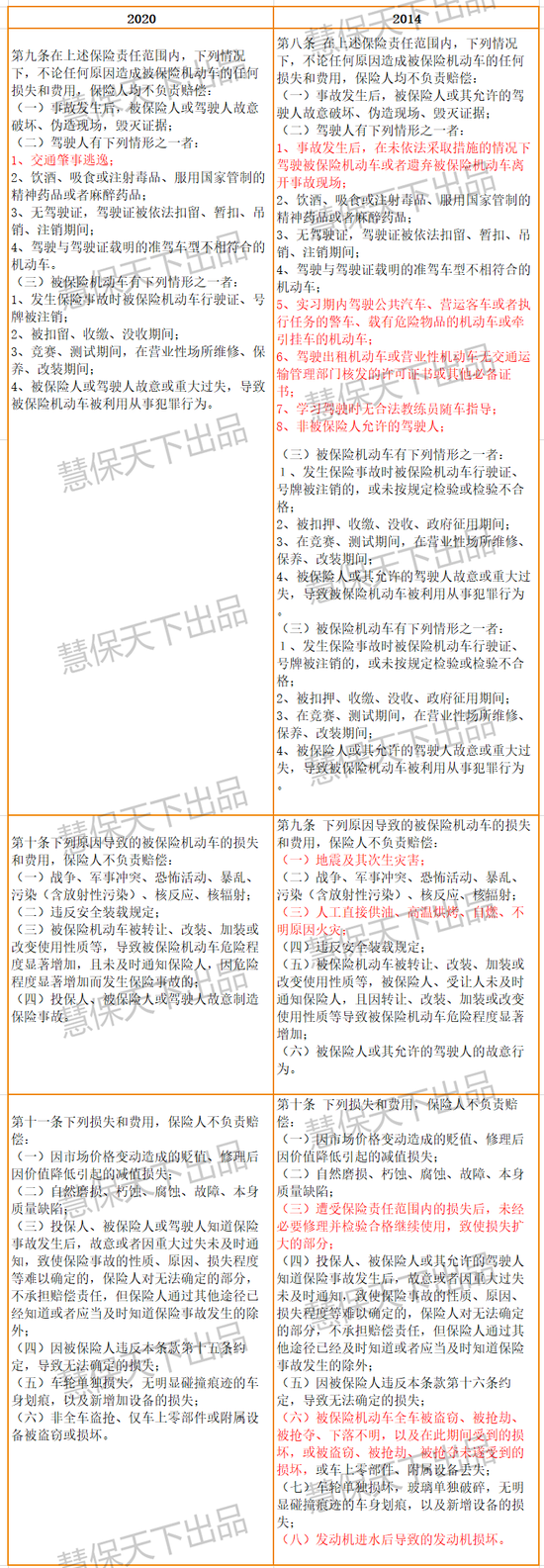 相对于2014版,2020版的责任免除大幅减少,如车损险中,原来当非被保险人允许的驾驶人造成车损时,保险公司赔偿责任免除,但在2020版本中,这一规定被删除,这意味着,即便是盗抢车辆者发生车损,保险公司也须履行赔偿责任。