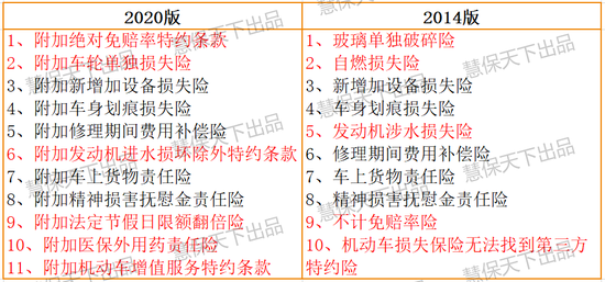 2020版本中,对上述条款取而代之或者新增的附加险则包括附加绝对免赔率特约条款、附加车轮单独损失险、附加发动机进水损坏除外特约条款、附加法定节假日限额翻倍险、附加医保外用药责任险、附加机动车增值服务特约条款等。