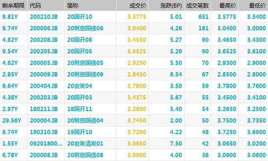 银行间主要利率债收益率上行4-7bp。截至17:00,10年期国开活跃券200210收益率上行5.01bp报3.5775%,5年期国开活跃券200208收益率上行5.02bp报3.4525%;10年期国债活跃券200006收益率上行4.26bp报3.04%,时隔逾一个月再度升破3%关口,创7月13日以来新高;5年期国债活跃券200005收益率上行5.5bp报2.9250%。