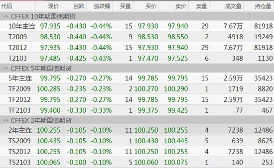 国债期货全线收跌,10年期主力合约跌0.44%报97.935元,创1月9日以来新低;5年期主力合约跌0.27%报99.795元,创1月3日以来新低;2年期主力合约跌0.1%报100.255元,创2019年12月20日以来新低。