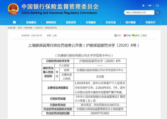 值得注意的是,此前8月5日,上海银保监局行政处罚信息公开表罚单显示,交通银行股份有限公司太平洋信用卡中心因对客户个人信息未尽安全保护义务、部分信用卡催收外包管理严重不审慎,被中国银行保险监督管理委员会上海建管局责令改正,并处罚款100万元。