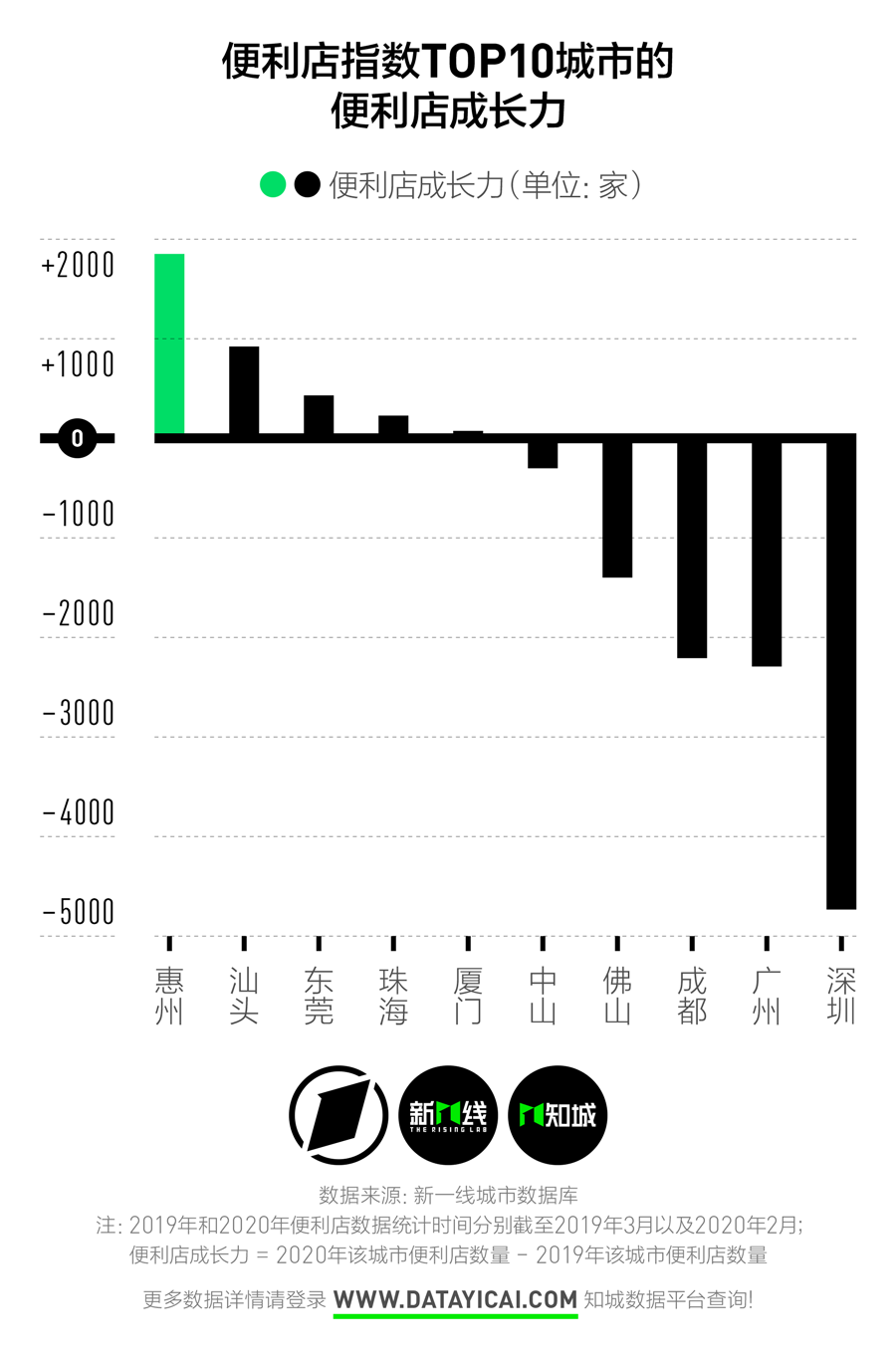 惠州便利店指数排名上升就是便利店扩张的结果。在大部分城市便利店数量负增长的大环境下,惠州新开便利店数目为1852家,远远超过其他城市,高居榜首。