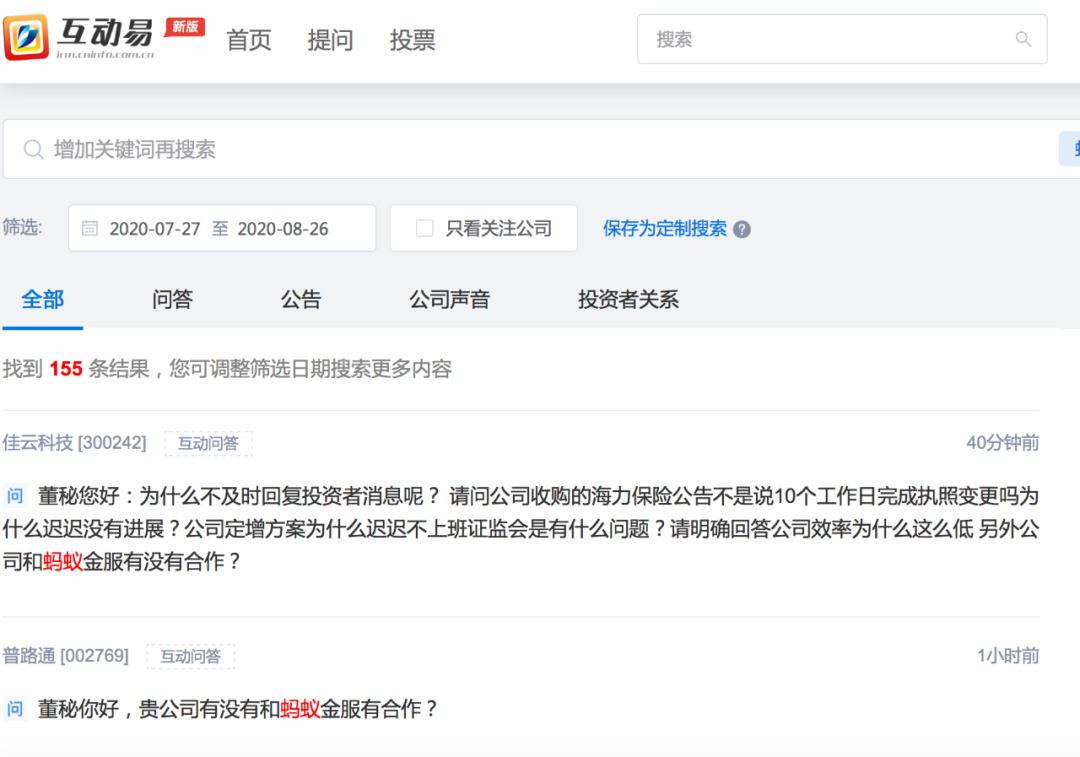 以蚂蚁金服为例,截至发稿,近一个月内,有关“蚂蚁金服”或“蚂蚁集团”的问答便有155条,问题集中于上市公司是否与蚂蚁金服合作、是否与蚂蚁金服存在业务关系等。