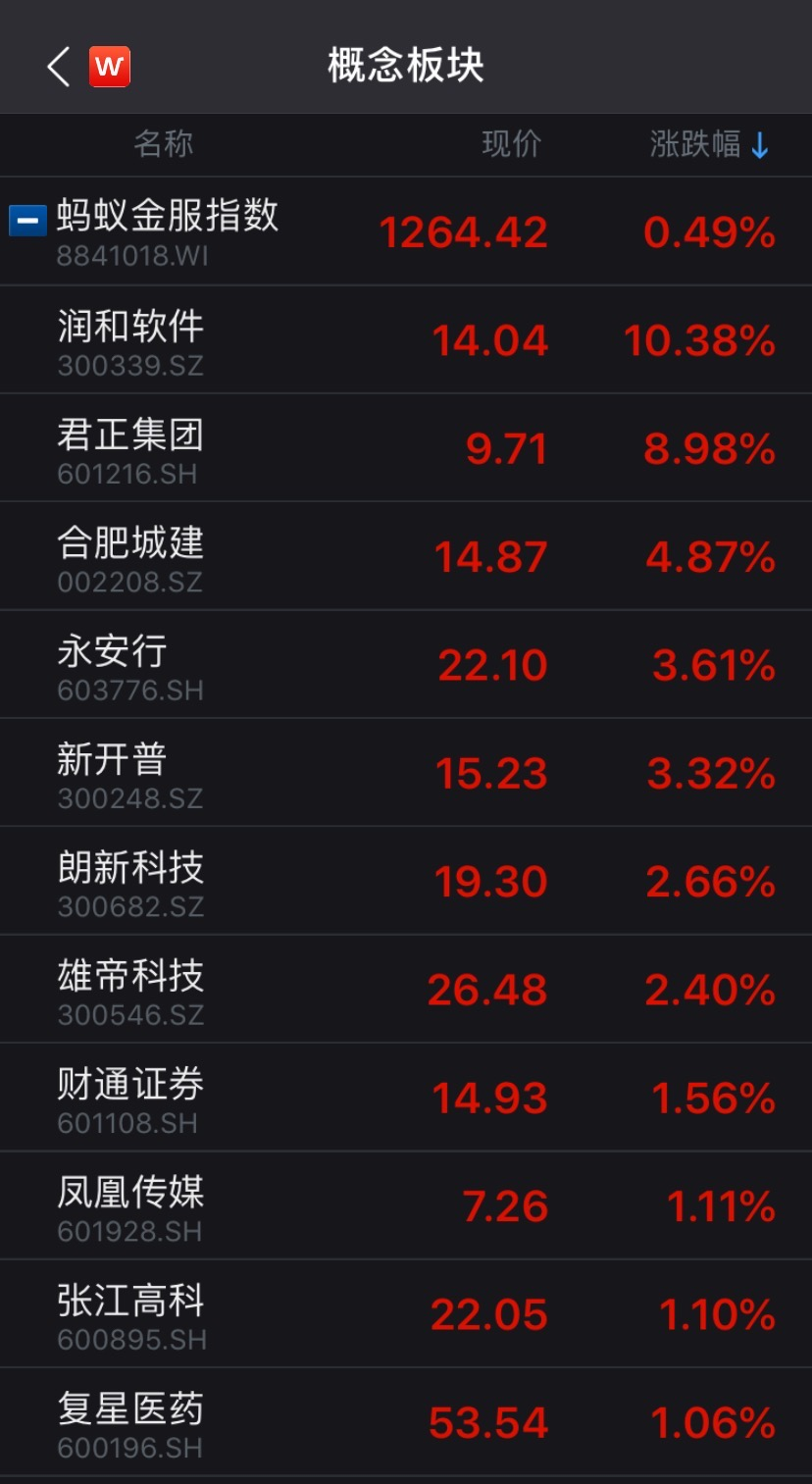 蚂蚁金服概念板块内部个股表现分化。润和软件涨逾10%,君正集团盘中触及涨停,午间收盘时涨8.98%;合肥城建涨逾4%。新华保险、科蓝软件均跌逾4%。
