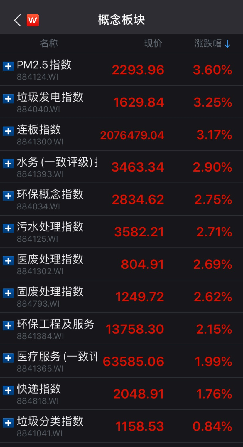 概念板块中,与环保相关的概念板块表现亮眼。截至午间收盘,PM2.5、垃圾发电概念板块均涨逾3%,环保、污水处理、医废处理、固废处理、环保工程及服务(一致评级)概念板块均涨逾2%。