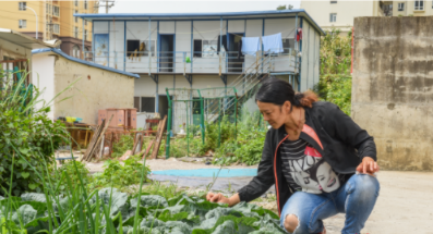 陈艳春:刚开始没有事,看到房子后面有片空地,就种了点芹菜、香葱、韭菜和茄子等十几种蔬菜。我们住在附近的业主回来的时候还会带点菜和肉。有时候没有菜,我们也掐着门口这些野菜吃。