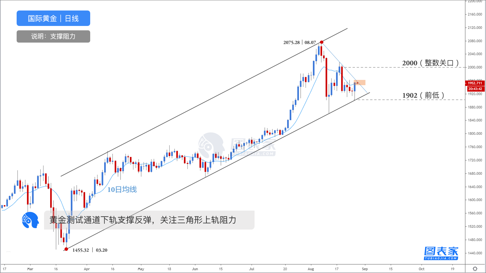 图为黄金日线走势,自8月7日高点以来,价格借助三角形横盘震荡,形成高点下移和低点上移。目前价格测试通道下轨支撑后反弹,正在测试10日均线和三角形上轨组成的共振位置。若该阻力破位,则阻力见2000关口。