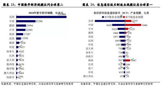 中国信息通信院数据显示,2018年中国数字经济规模已达4.7万亿美元,位列全球第二,预计2025年整体规模将翻一番。信息通信技术(ICT)产业规模方面,中国ICT服务业规模达4243亿美元,位居全球第二,ICT制造业规模达5446亿美元,位居全球第一。此外,中国获取数据资源的能力也与美国形成竞争,手机应用月活跃用户数、热门网站访问量排行中,中国多个应用、网站跻身前列。