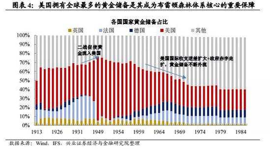 布雷顿森林体系时期:全球货币是以黄金为锚的美元体系。1944年,以美国为主导的布雷顿森林体系成立,其本质是一个以黄金为锚的美元体系。美国自20世纪20年代开始,就是全球黄金储备最多且唯一能随时保持黄金可兑换的经济体,这是美元成为布雷顿森林中心货币的重要保障。在世界各国的认知中,“美元和黄金一样好”,而美元如果作为存款相比于黄金而言又具有可生息的优点,因此各国政府更愿意储蓄美元和美国国债而非黄金,从而提升了美元的储备货币的地位。
