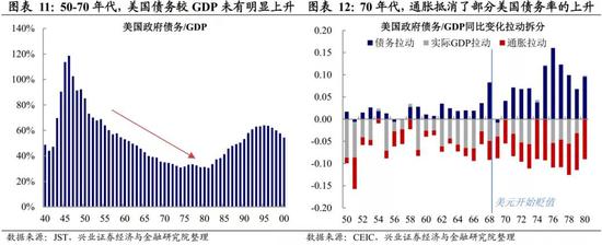 以美元贬值叠加通胀的方式,美国最终化解了高债务问题。正如前面所阐述的,自60年代后期开始,受越南战争军事开支的影响,美国面临的财政赤字压力日益加大,但与此同时我们并未看到美国债务率的压力,反而美国政府债务率延续了二战后的下行趋势直至1981年。从拆分来看,通胀对这一时期美国政府债务率的下降起到了巨大的作用。