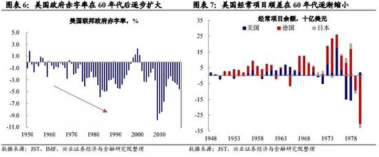 美国经常项目余额顺差逐渐缩小。一方面,德国和日本出口的增加挤占了美国的出口份额,美国经常项目余额相对日德快速萎缩。另一方面,布雷顿森林体系的机制设计需要美国长期保持国际收支逆差,才可以为全球贸易提供足够多的美元,即“特里芬难题”。20世纪50年代,美国的项目余额多为逆差,虽然60年代初转为顺差,但自1968年之后美国经常项目再度失衡,出现逆差。