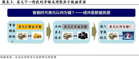 本轮“高债务+大放水”的终点可能是美国在货币体系上“改旗易帜”。如前所述,从上世纪的历史来看,在1930年代大萧条的末期和1970年代的“滞胀”时期,美国都曾通过美元的大幅贬值来征收“铸币税”,达到了对外转嫁成本的目的。本轮新冠肺炎疫情冲击下,全球供需错配的矛盾被进一步激化,美国债务率再次逼近二战时的高点,双赤字压力上升,美元贬值依然符合美国的利益。但是在美元贬值过程中,美国需要保证全球依然维持以美元为中心的货币体系。在上世纪货币体系变化过程中,美元的锚从黄金转变到了石油,接下来美元新的“锚”可能是数据。